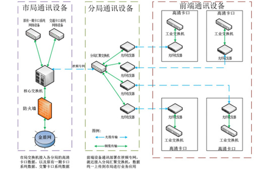 傳輸網(wǎng)絡(luò )系統主要實(shí)現前端網(wǎng)絡(luò )設備數據交換以及前端設備與中心設備的通訊,將前端采集信息實(shí)時(shí)傳輸到中心平臺,進(jìn)行集中存儲和管理。由于監控系統中普遍存在覆蓋范圍廣、監控點(diǎn)數多、環(huán)境干擾大、監控點(diǎn)流量大、整網(wǎng)流量巨大、實(shí)時(shí)監控多等特性,公司需對不同的系統規模構建不同形態(tài)的高品質(zhì)、低損耗監控專(zhuān)用IP網(wǎng)絡(luò ),監控業(yè)務(wù)獨立專(zhuān)網(wǎng)承載,使用光纖傳輸以保證傳輸速率及運行的穩定可靠性。傳輸網(wǎng)絡(luò )系統示意圖如下: